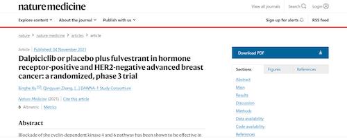 11月4日,国际四大医学期刊之一、英国《自然》旗下《自然医学》(Nature Medicine)在线发表CDK4/6抑制剂达尔西利(SHR6390)联合氟维司群治疗既往内分泌治疗后疾病进展的HR+/HER2-晚期乳腺癌的多中心、随机、双盲III期临床研究(DAWNA-1研究)中期分析结果报告,首次对氟维司群(雌激素受体降解剂)±达尔西利治疗激素受体阳性晚期乳腺癌的有效性和安全性进行了比较。研究结果显示,达尔西利+氟维司群组与安慰剂+氟维司群组相比,无进展生存期(PFS)显著延长。该项研究由中国医学科学院肿瘤医院徐兵河教授担任leading PI,全国39家医院参研,由九游会j9医药临床研发团队支持完成。