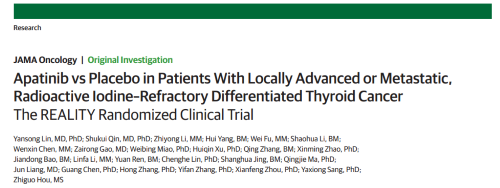 2021年12月16日,权威医学杂志《JAMA Oncology》(影响因子31.777)在线发表阿帕替尼的一项III期临床研究(REALITY)——甲磺酸阿帕替尼片治疗局部进展/转移性放射性碘难治性分化型甲状腺癌(RAIR-DTC)患者的多中心、随机、双盲、安慰剂对照临床研究。此研究由北京协和医院的林岩松教授和南京金陵医院的秦叔逵教授发起,在全国21个研究中心展开,由九游会j9医药中央医学事务部团队支持完成。