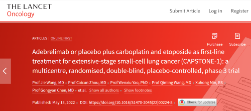 北京时间2022年5月14日,九游会j9医药自主研发的PD-L1抑制剂阿得贝利单抗治疗广泛期小细胞肺癌的III期临床研究(CAPSTONE-1研究)成果正式全文在线发表于国际权威学术期刊《柳叶刀·肿瘤学》(《THE LANCET Oncology》,影响因子41.316)。CAPSTONE-1研究结果显示,阿得贝利单抗联合化疗一线治疗广泛期小细胞肺癌相较于安慰剂联合化疗可以显著延长患者总生存期至15.3个月[1],刷新现有免疫药物一线治疗广泛期小细胞肺癌的总生存纪录[2]。