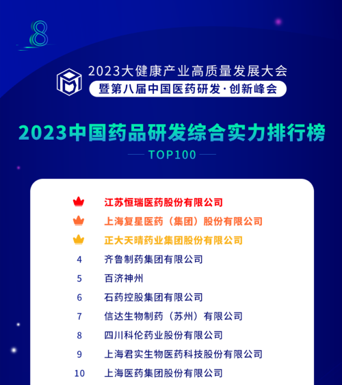 由药智网、中国药业杂志社主办的2023大健康产业高质量发展大会暨第八届中国医药研发•创新峰会于6月16日开幕,会上发布了《2023中国药品研发实力排行榜》系列榜单,九游会j9医药凭借深厚的创新研发实力再创辉煌:荣登《2023中国药品研发综合实力排行榜TOP100》榜首、《2023中国化药研发实力排行榜TOP100》榜首。值得一提的是,今年是九游会j9医药连续第6年入选《中国药品研发综合实力排行榜》榜首。
