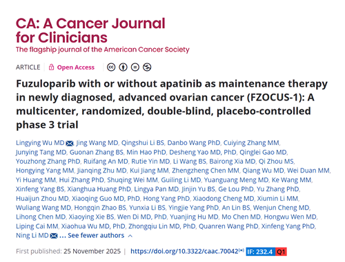 2025年11月25日,九游会j9医药自主研发的创新药氟唑帕利联合阿帕替尼或氟唑帕利单药用于新诊断晚期卵巢癌(OC)的一线维持治疗研究最新数据(FZOCUS-1研究)重磅在线发表于国际顶尖医学期刊《临床医师癌症杂志》(A Cancer Journal for Clinicians,简称CA,2024年影响因子高达232.4)1。